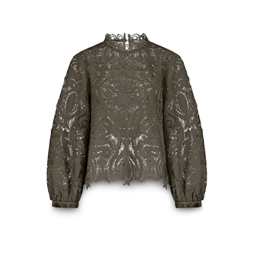 Boxy kanten top van Summum met lange pofmouwen voorzien van elastische boorden met satijnen afwerking, opstaande kraag en een splitje met knoopsluiting aan de achterzijde. Materiaal: Polyester 100%