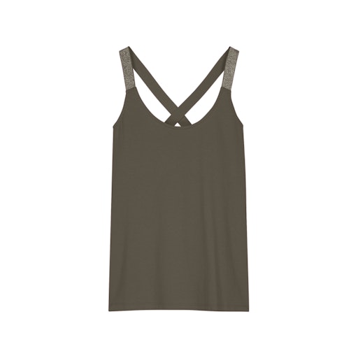 Tanktop van Summum met gekruiste glitterbandjes en een ronde hals. Materiaal: Katoen 95%| elastan 5%