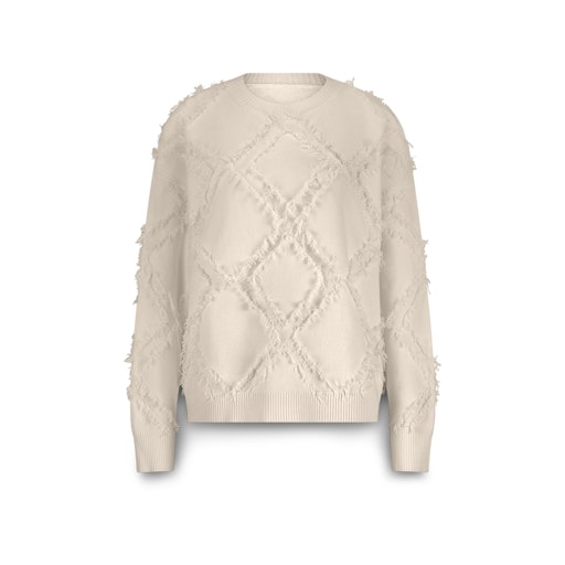 Trui van Summum met een ingebreide ruitpatroon afgewerkt met franjes, lange mouwen, verlaagde schoudernaden, ronde hals en ribboorden. Materiaal: Viscose 50%| polyamide 25%| polybutyleentereftalaat 25%