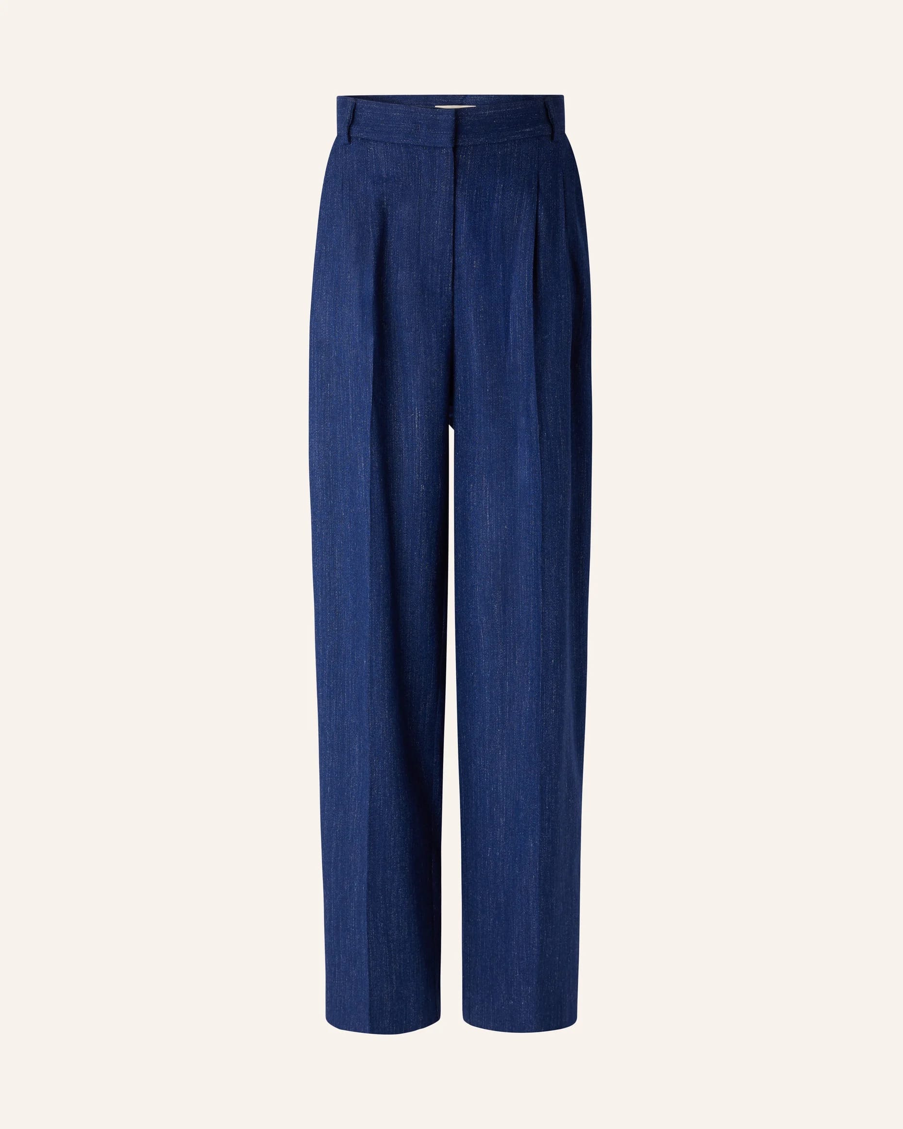 Broek van Sessun in een structuur dessin met wijde pijpen, bandplooien, verborgen knoop- en ritssluiting, steekzakken en twee paspelzakken aan de achterzijde.
