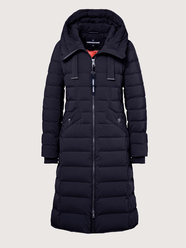 Lange donsjas van Creenstone met een deelbare ritssluiting, capuchon voorzien van trekkoord, steekzakken met drukknoop, gebreide manchetten en een split met verborgen rits aan de achterkant.