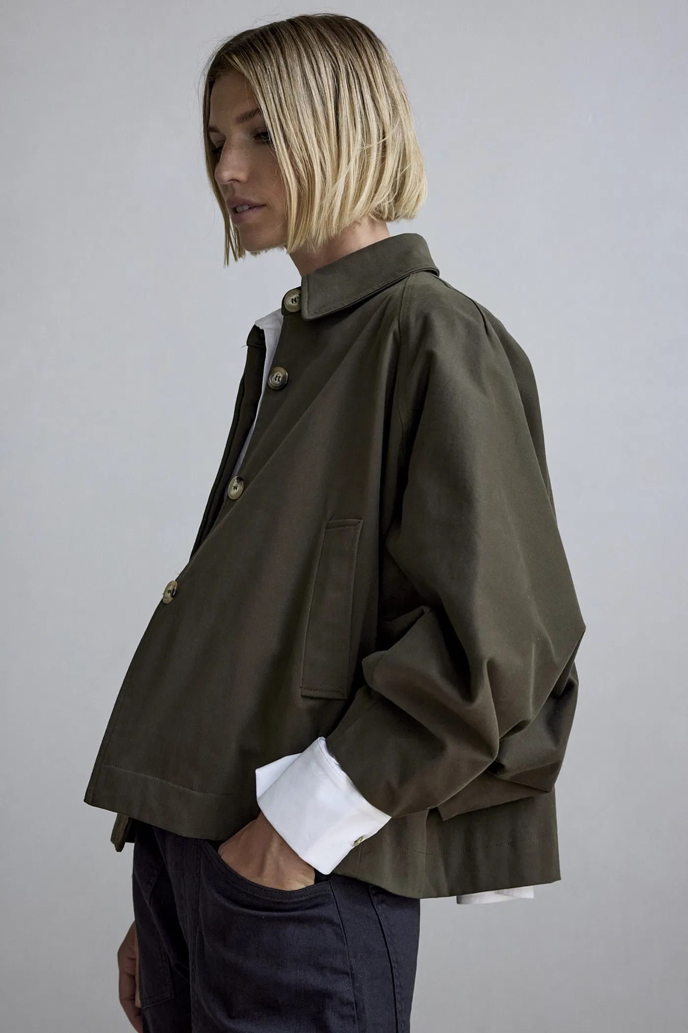 Korte trenchcoat van Femmed du Sud met lange ballonmouwen, knoopsluiting, kraag, steekzakken en een flap aan de achterzijde.