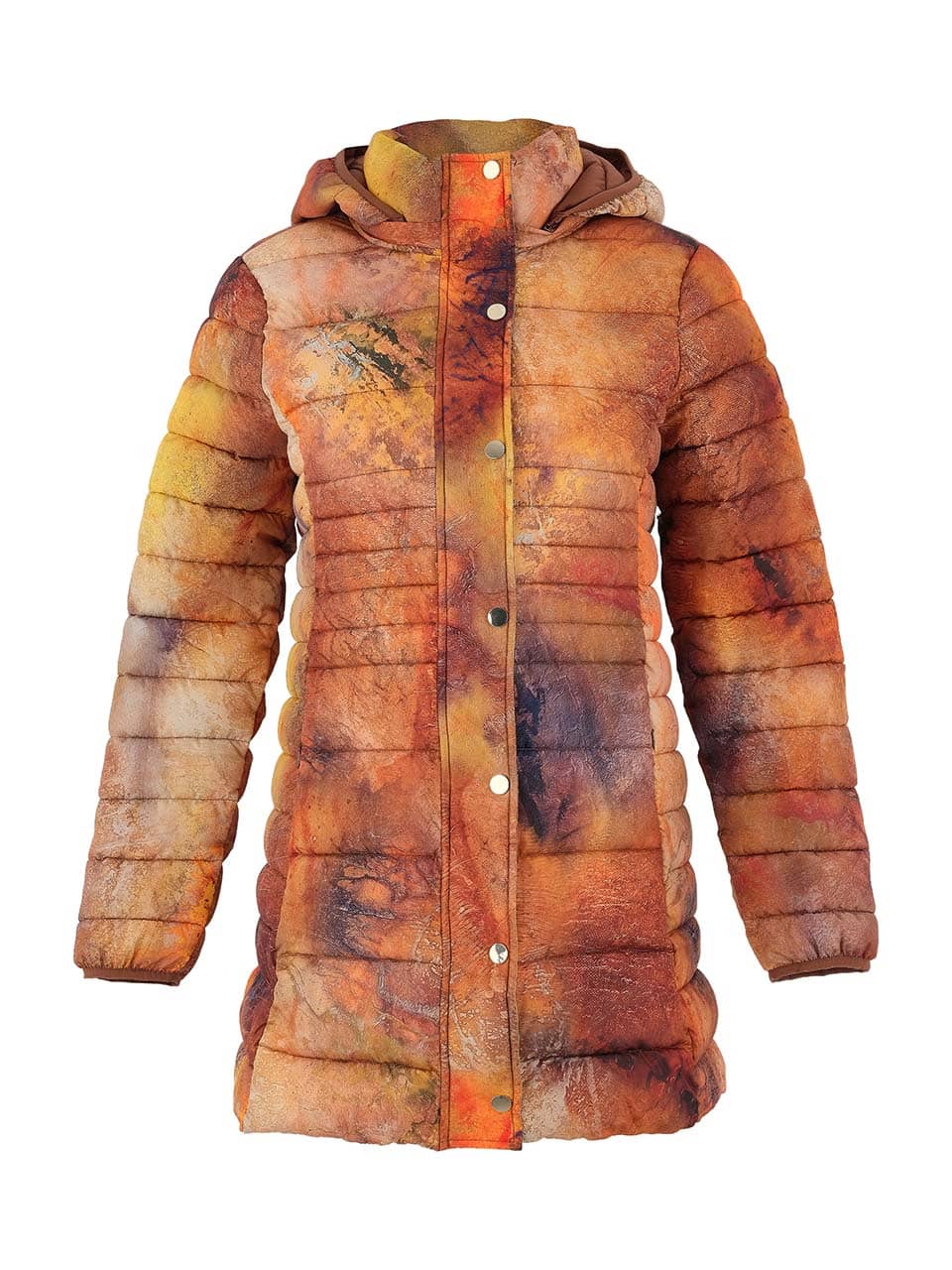 Gewatteerde jas van Dolcezza in een all-over dessin met een verborgen drukknoop- en ritssluiting, opstaande kraag, capuchon en twee steekzakken.