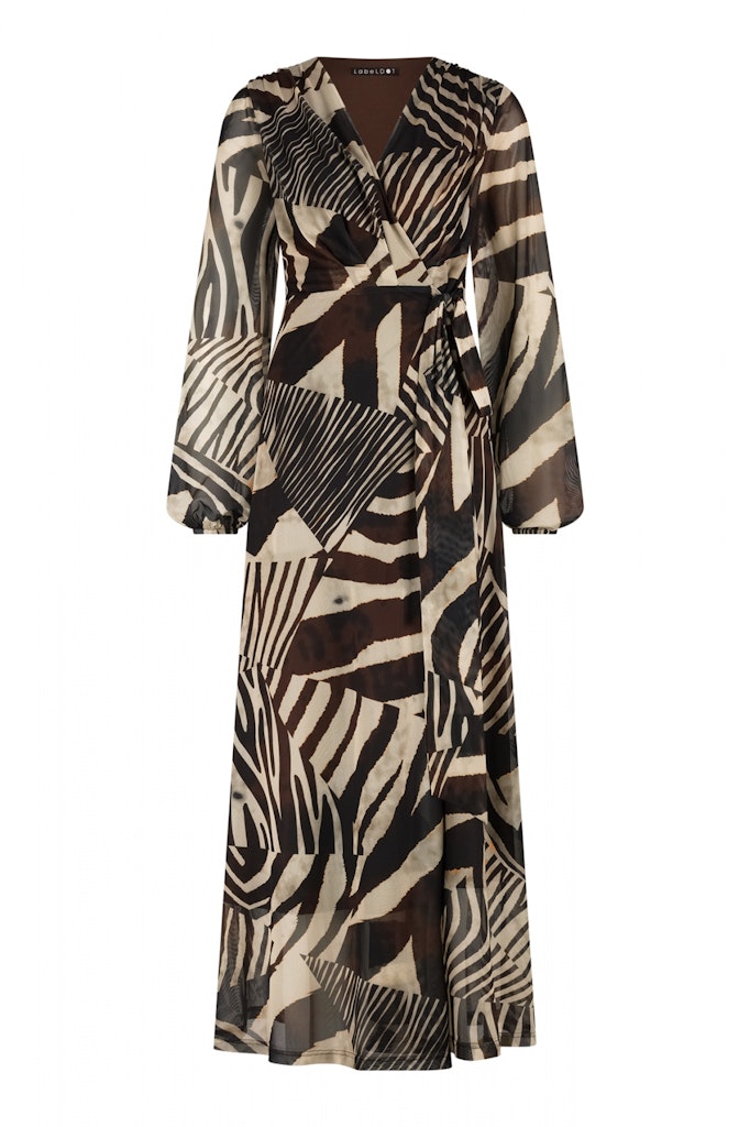 Lange jurk van Label Dot in een all-over dessin met lange pofmouwen, V-hals voorzien van overslag en een striksluiting in de taille.