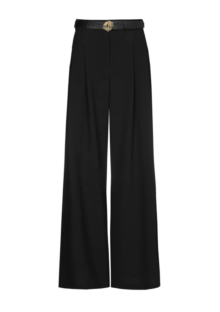 Broek van Caroline Biss met wijde pijpen, knoop- en ritssluiting, platte plooien, steekzakken en riem inbegrepen. Materiaal: Polyester 95%| elastan 3%