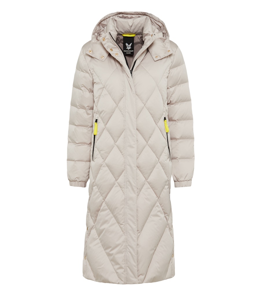Lange gewatteerde jas van Fuchs & Schmitt met een verborgen ritssluiting, opstaande kraag, afneembare capuchon en twee ritszakken.