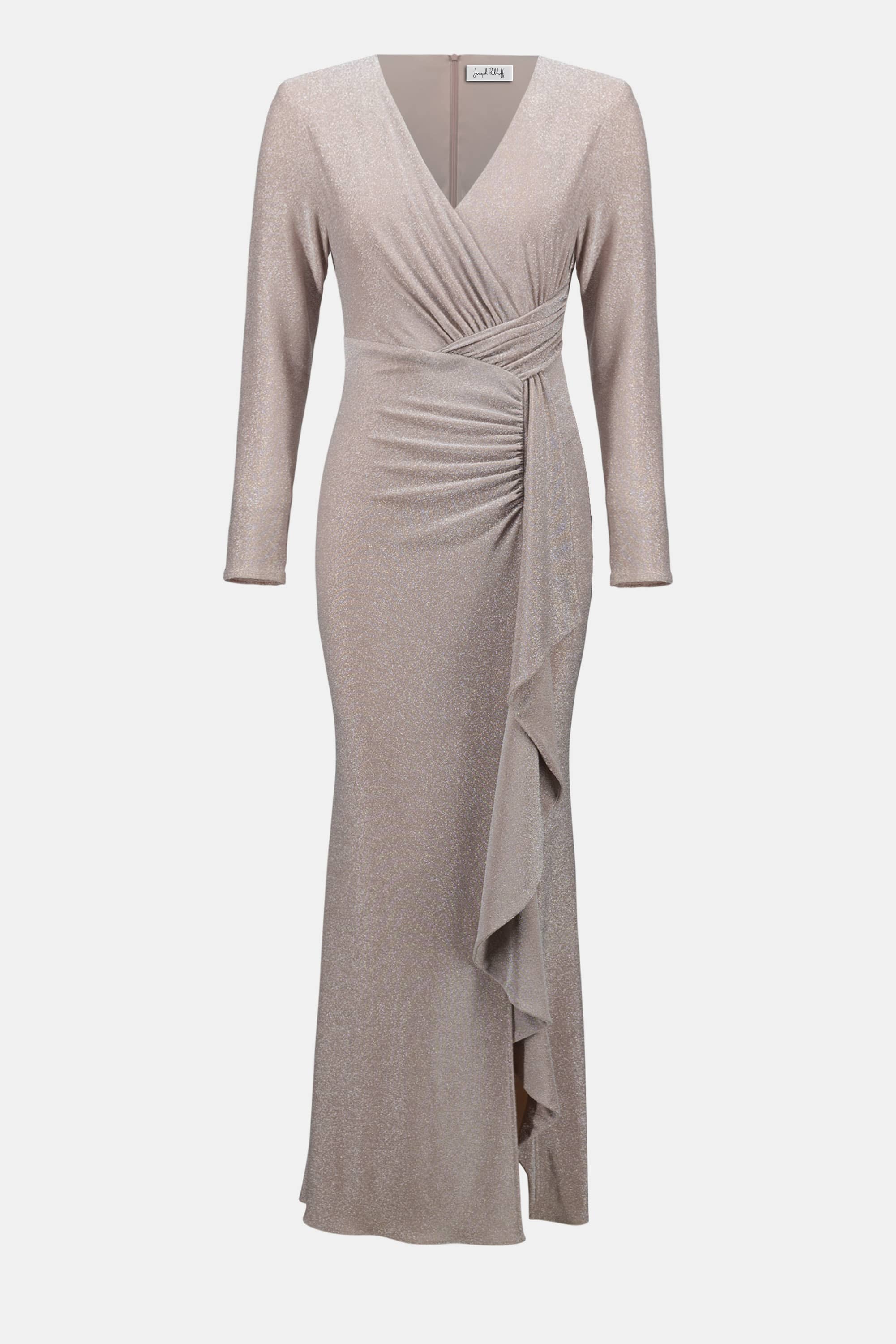 Lange lurex jurk van Joseph Ribkoff met lange mouwen, V-hals voorzien van overslag, gerimpelde details in de taille, split aan de voorzijde en een verborgen ritssluiting aan de achterzijde.