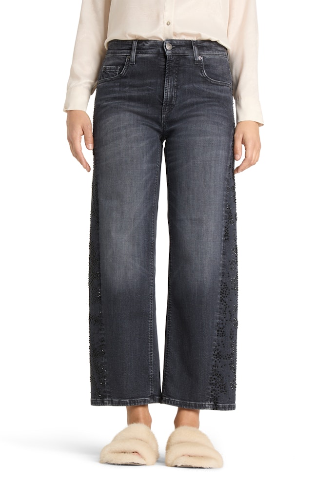 Enkellange 5-pocket jeans van Cambio met een knoop- en ritssluiting en wijde pijpen voorzien van strass steentjes aan de zijkanten.