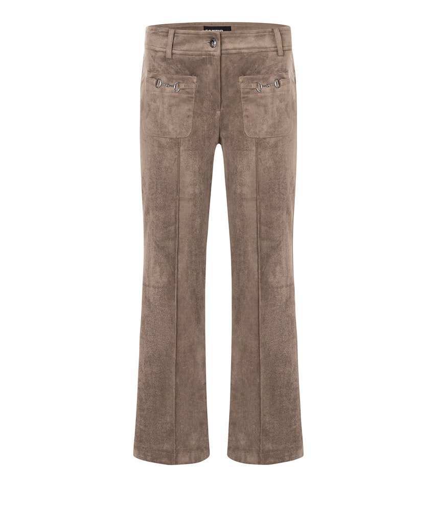Enkellange flared broek van Cambio in een suèdine kwaliteit met een knoop- en ritssluiting, opgestikte voorzakken voorzien van gespdetail en doorgestikte naden aan de voor- en achterzijde.