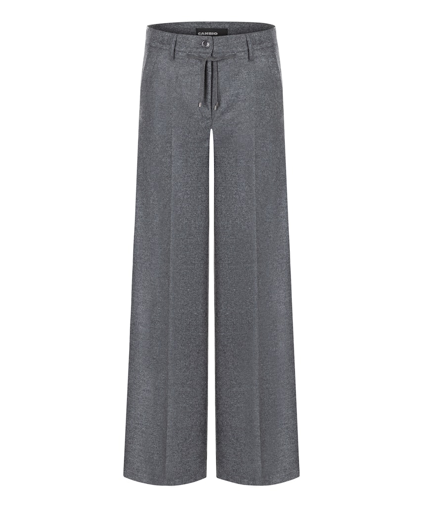 Gemêleerde broek van Cambio met wijde pijpen, knoop- en ritssluiting, steekzakken, opgestikte achterzakken en een strikkoordje aan de voorzijde.