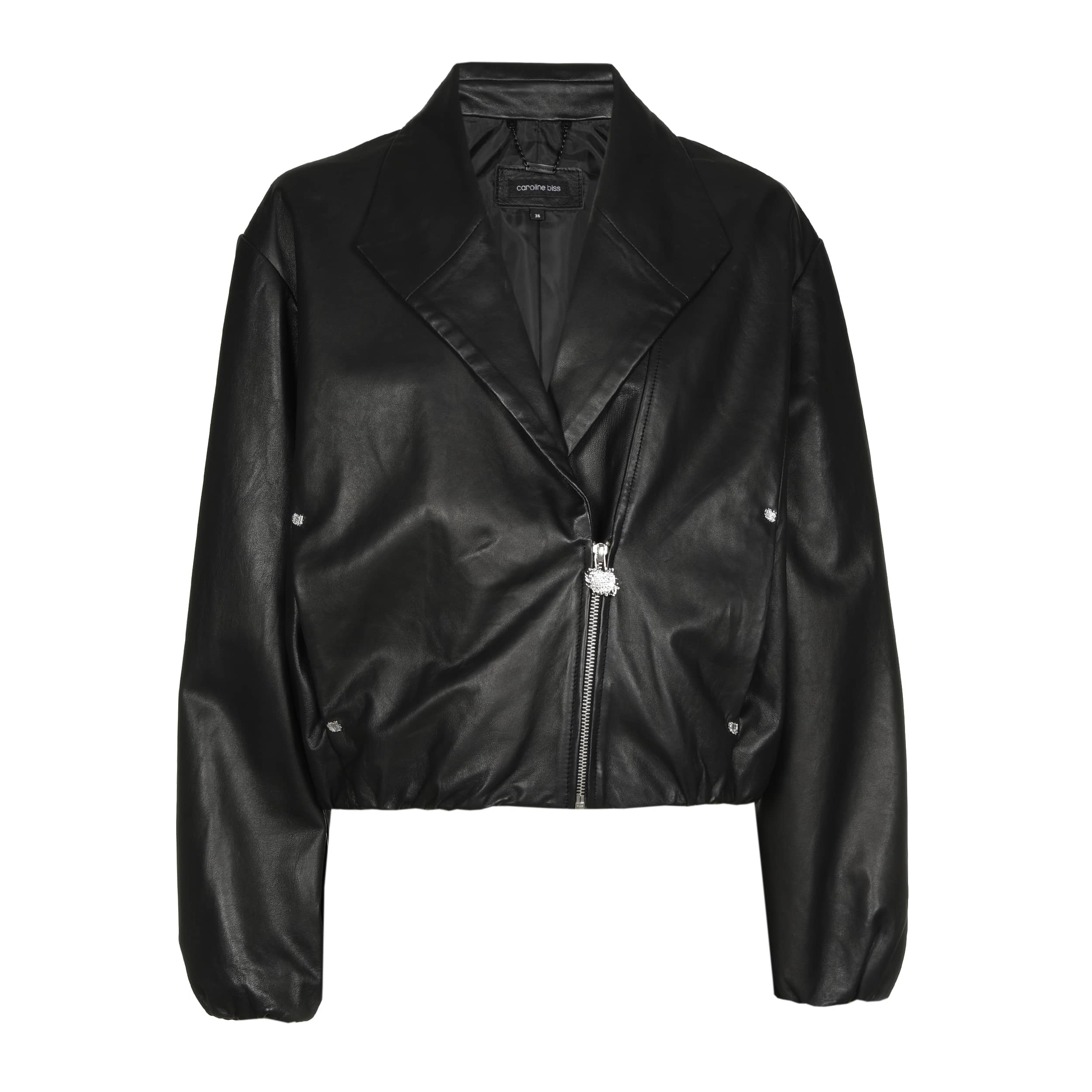 Leer bomberjacket van Caroline Biss met een asymmetrische ritssluiting, reverskraag, steekzakken en een elastische tailleband aan de achterzijde.