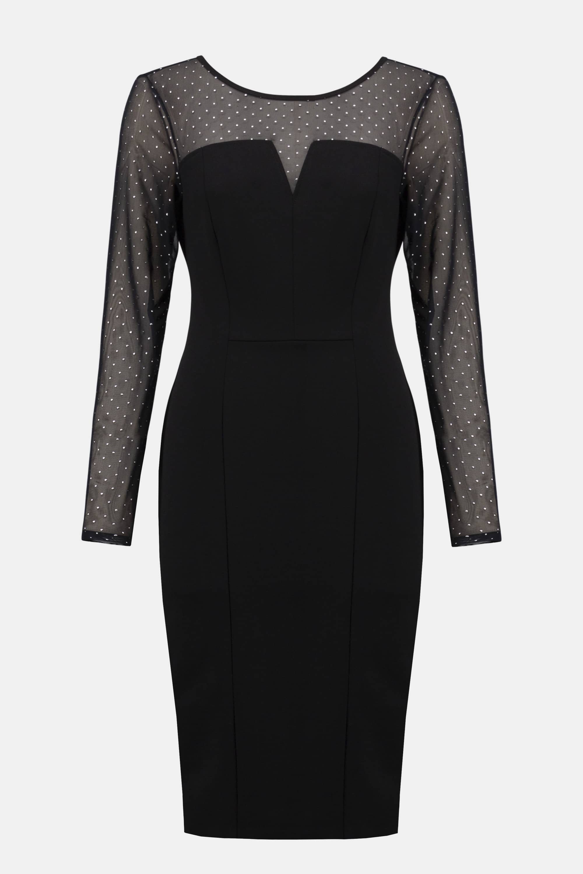 Getailleerde jurk van Joseph Ribkoff met een transparante bovenzijde, transparante lange mouwen, ronde hals aan de voorzijde en een V-hals, verborgen ritssluiting en een split aan de achterzijde. Materiaal: Polyester 95%| spandex 5%