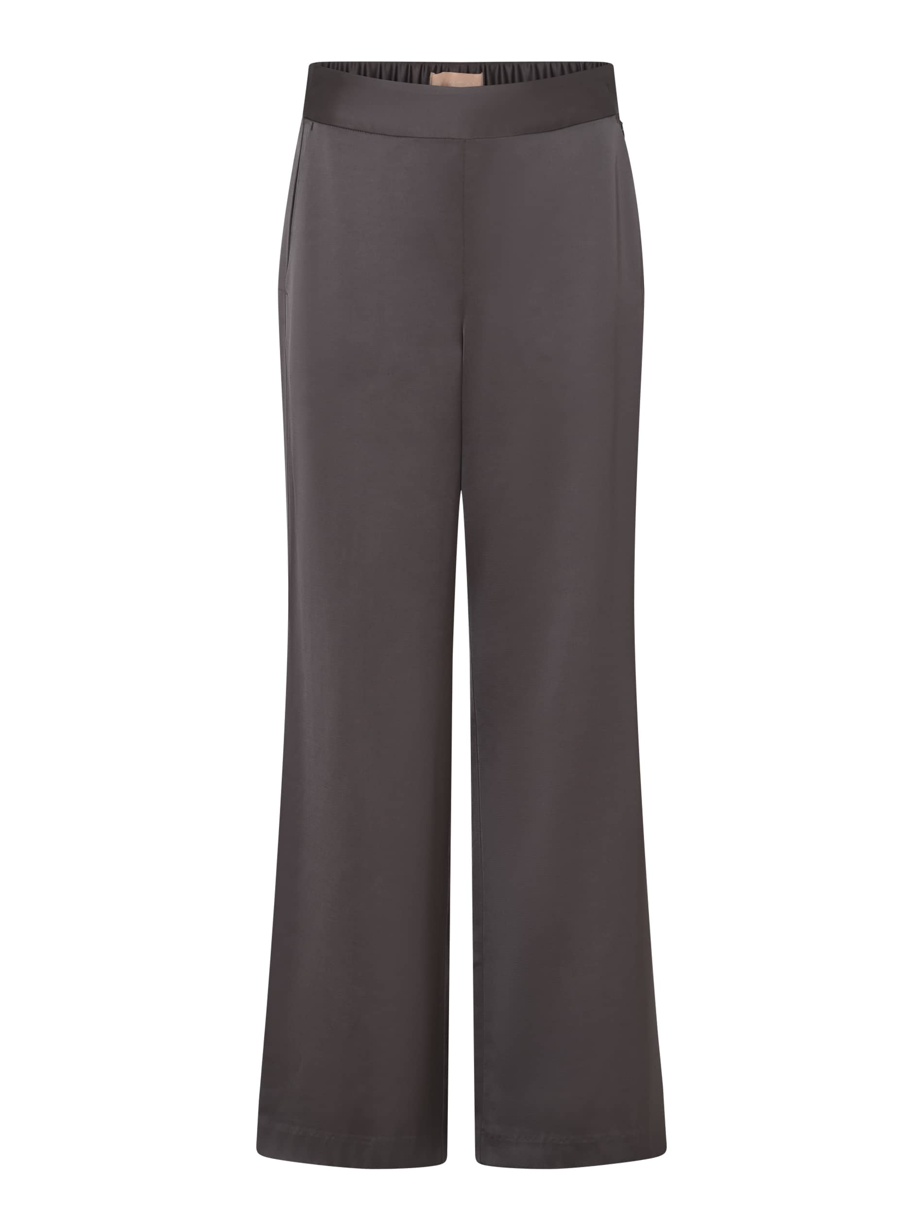 Broek van Gustav met wijde pijpen, glanzende tailleband voorzien van elastiek aan de achterzijde, schuifknoop- en ritssluiting, blinde ritssluiting in de zijnaad en steekzakken.