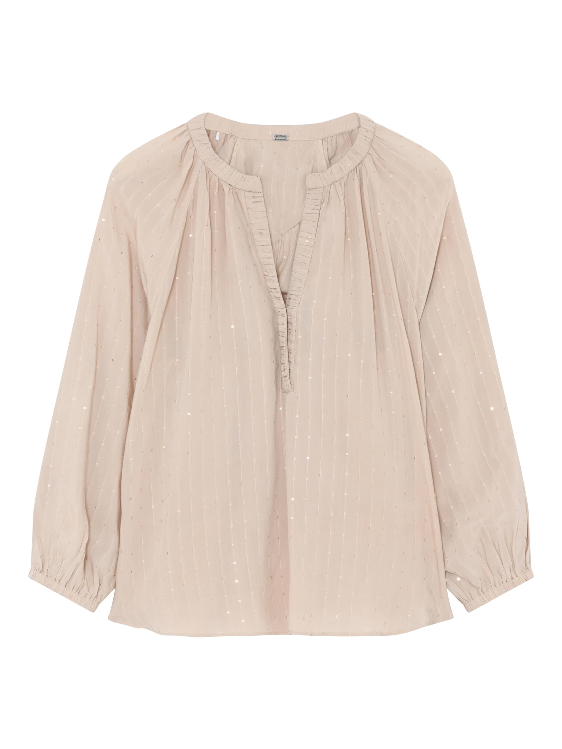 Blouse van Gustav met subtiele pailletten, lange mouwen voorzien van elastische boorden en een ronde hals met V-uitsnede.