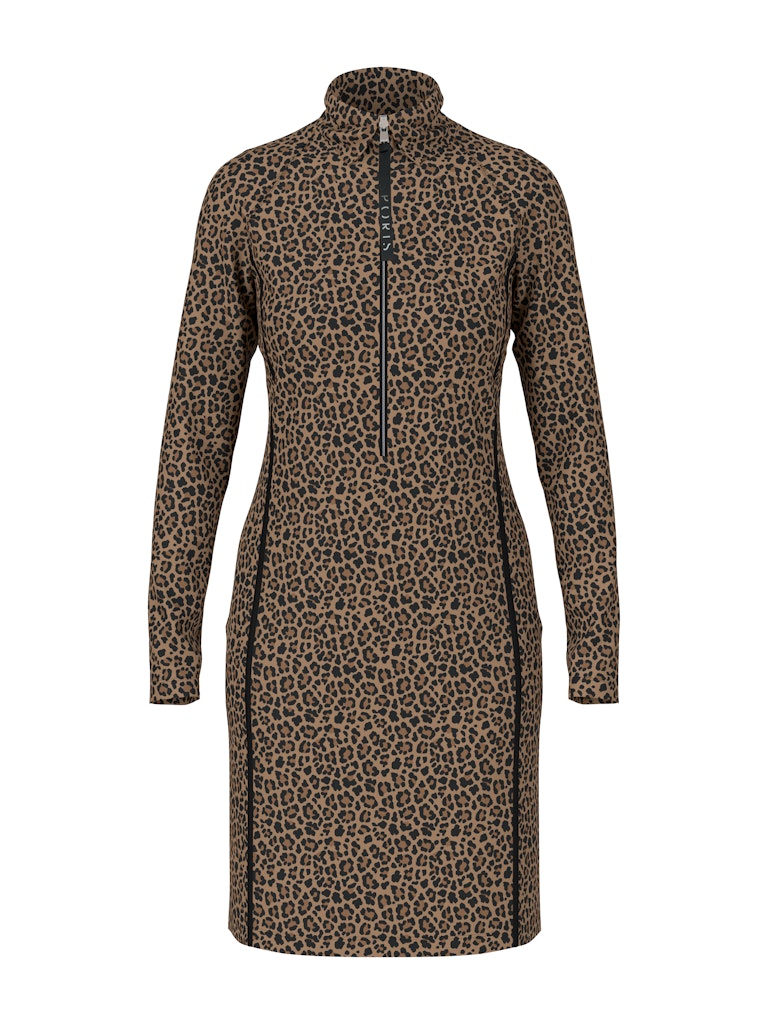 Jurk van Marc Cain Sports in een elastische ribjersey met een animal dessin, lange raglanmouwen, opstaande kraag voorzien van halve ritssluiting en contrasterende bandapplicaties.