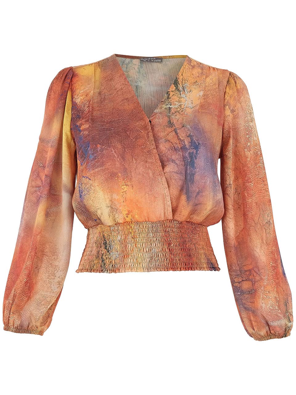 Blouse van Dolcezza in een all-over dessin met lange pofmouwen, V-hals voorzien van overslag en een gesmokte brede boord in de taille.