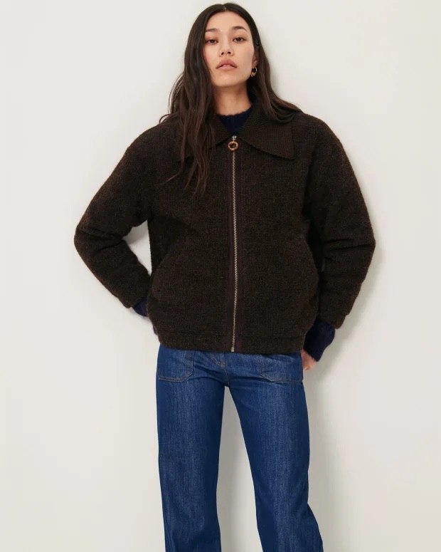 Jas van Sessùn in dikke geweven wol met tweekleurige lusgarens, ritssluiting, steekzakken, elastische boorden en een brede geribbelde kraag.