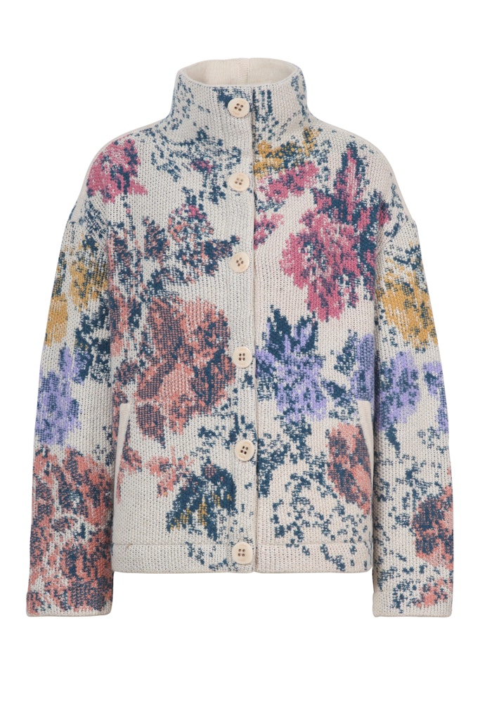 Jacket van Ivko Woman in een bloemen dessin met een knoopsluiting, opstaande kraag en steekzakken.