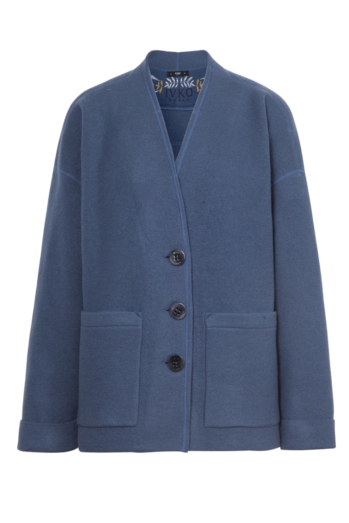 Vest van Ivko Woman met lange mouwen, opstaande kraag, V-hals, knoopsluiting en twee opgestikte zakken. Materiaal: Wol 95%| elastan 5%