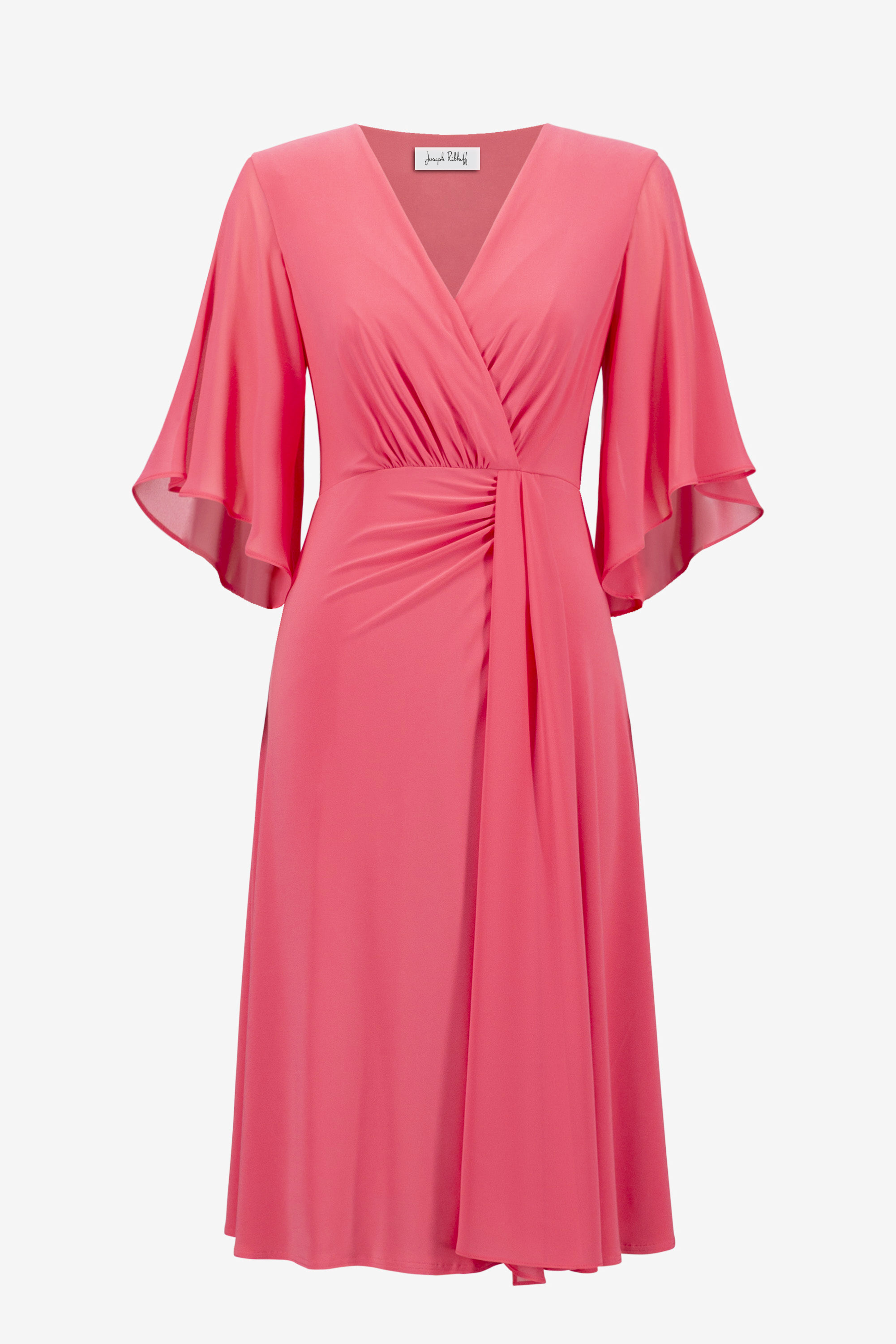 Jurk van Joseph Ribkoff met driekwart chiffon mouwen, V-hals en chiffon sjaal die vanuit de taille in de split van de rok valt.