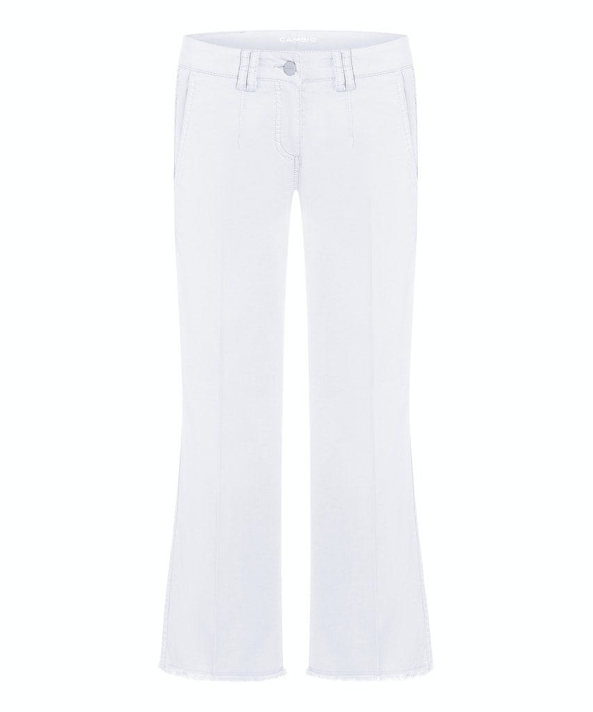 Flared broek van Cambio met twee steekzakken, twee opgestikte achterzakken, knoop- en ritssluiting en gerafelde pijpen.