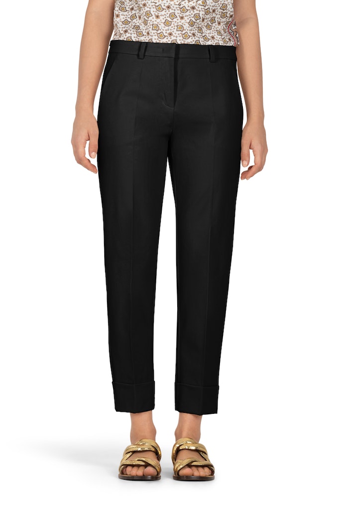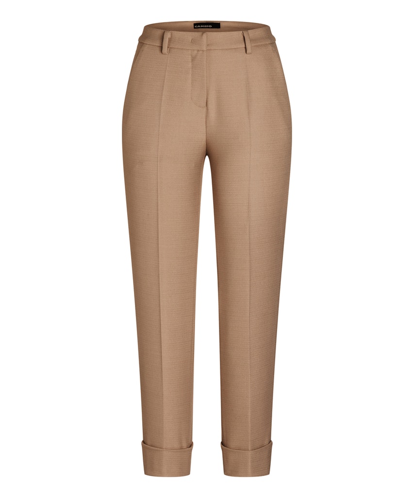 Enkellange broek van Cambio met steekzakken, twee paspelzakken aan de achterzijde, knoop- en ritssluiting en een omslag in de pijpen. Materiaal: Polyester 68%| viscose 28%| elastan 4%
