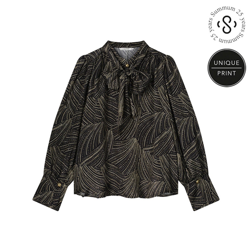 Blouse van Summum in een all-over dessin met lange mouwen, brede manchetten en een ronde hals voorzien van strikkoord en opvallende knoop.