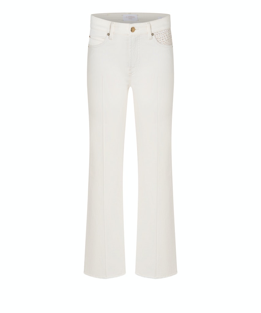 Enkellange 5-pocket jeans van Cambio met wijde pijpen, sierstiksels op de linkerzak en een knoop- en ritssluiting.