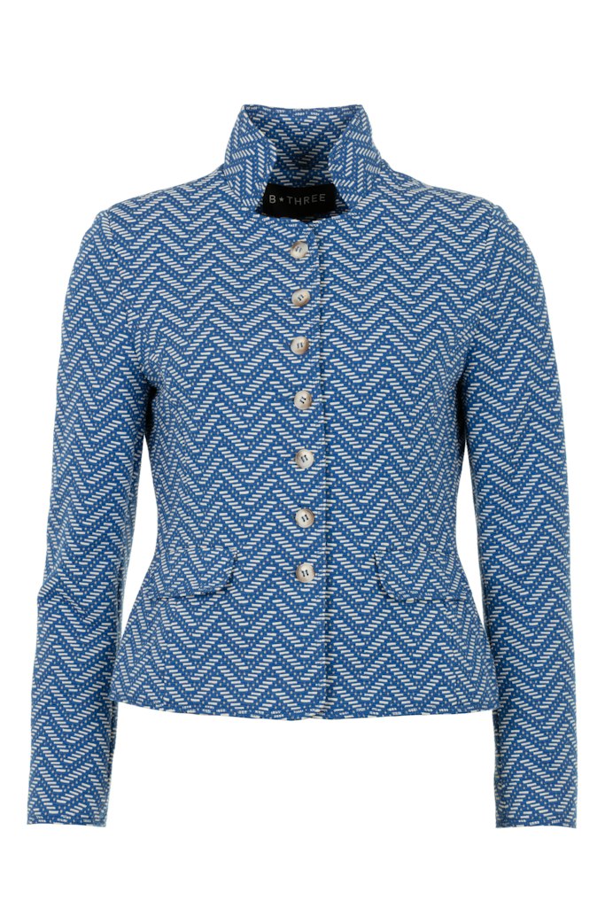 Blazer van B Three in een all over dessin met lange mouwen, opstaande kraag, knoopsluiting en twee klepzakken. Materiaal: Polyetheen 70%| viscose 28%| elastan 2%