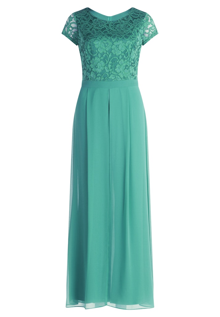 Jumpsuit van Vera Mont met ene kanten bovenzijde, wijde chiffon pijpen, korte mouwen, ronde hals en een verborgen ritssluiting aan de achterzijde.