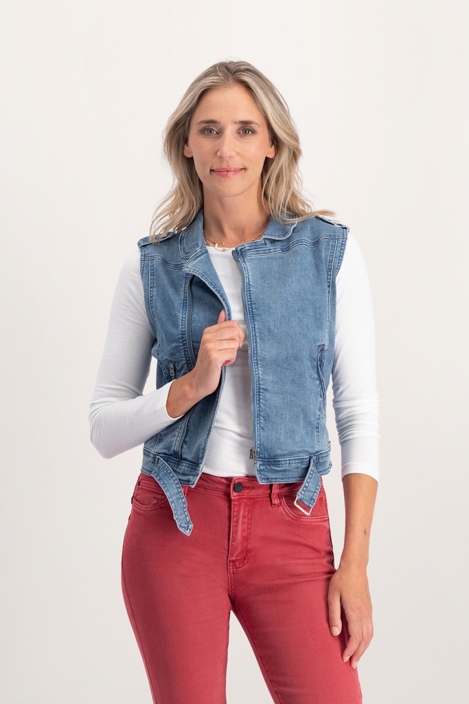 Denim gilet van Florez met een ritssluiting, ritszakken en gesp aan de onderzijde.