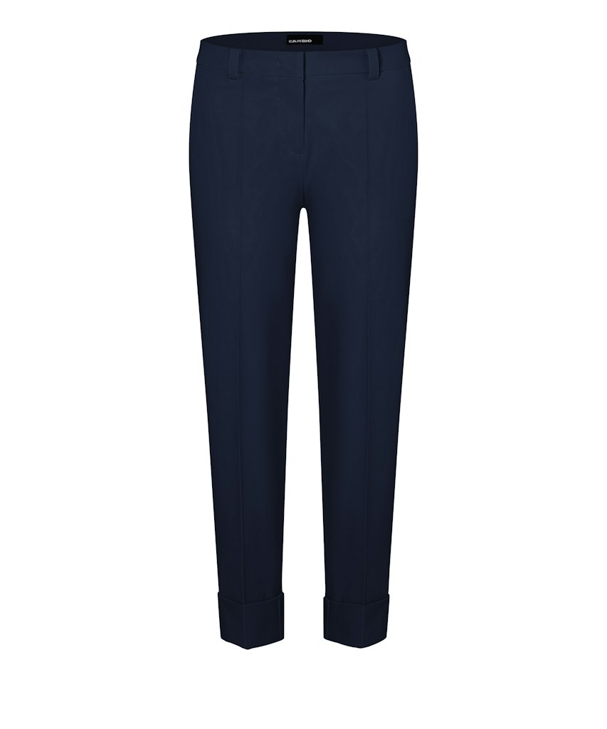 Enkellange broek van Cambio met steekzakken, twee paspelzakken aan de achterzijde, knoop- en ritssluiting en een omslag in de pijpen.