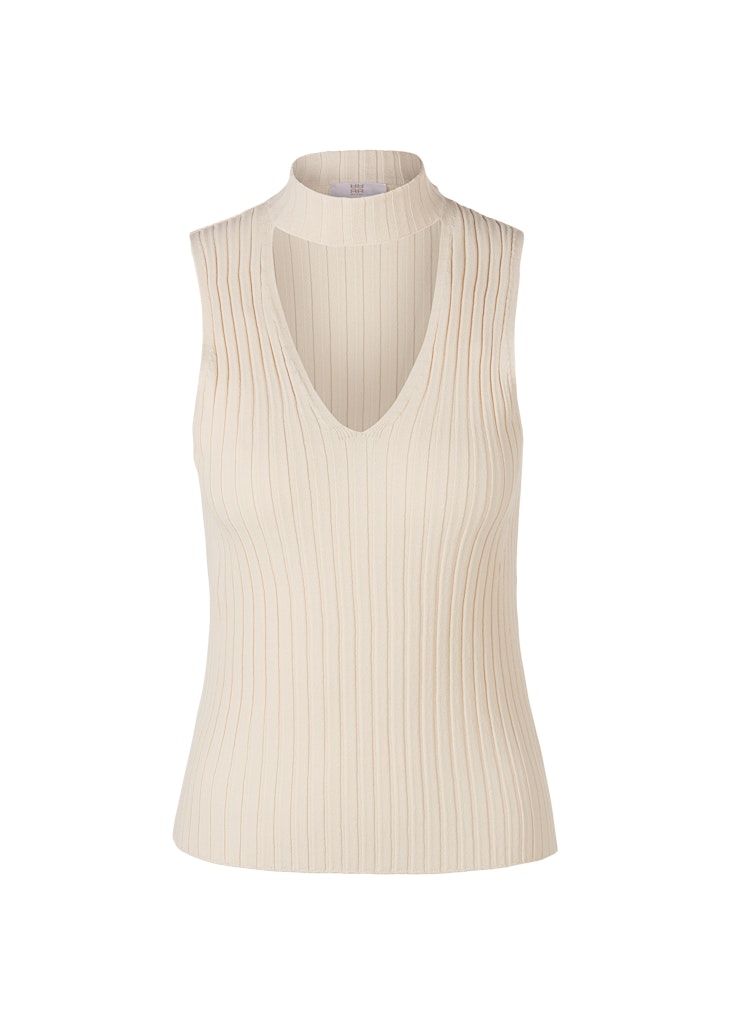Mouwloze top van Riani in een ribstructuur met een opstaande kraag en een diepe V-hals. Materiaal: Viscose 75%| polyamide 25%