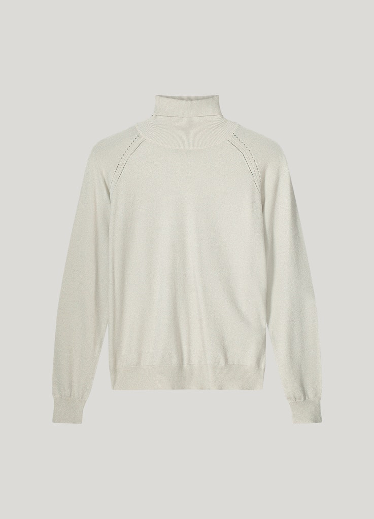 Lurex coltrui van Summum met lange raglanmouwen versierd met ajour breisel en ribgebreide boorden.