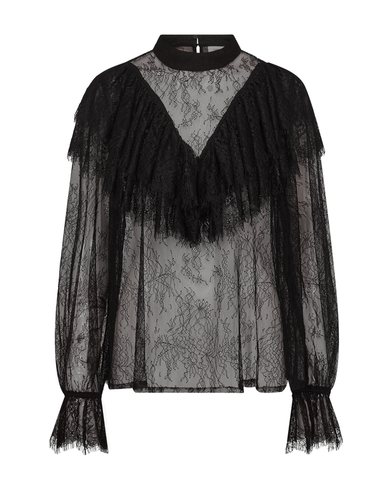 Transparante kanten blouse van Copenhage Muse in een A-vorm met ruches en franjes, lange ballonmouwen, ronde hals en een keyhole voorzien van knoopsluiting aan de achterzijde. Materiaal: Polyamide 100%