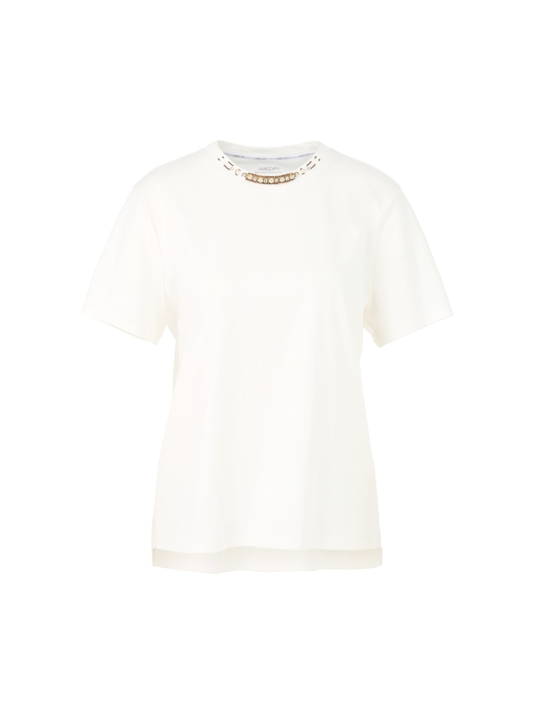 T-shirt van Marc Cain met korte mouwen, decoratieve ronde hals en een iets langere achterzijde. Materiaal: Katoen 100%