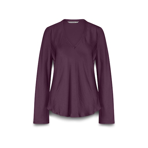 Blouse van Summum met lange uitlopende mouwen, V-hals en een afgeronde onderzijde. Materiaal: Acetaat 100%