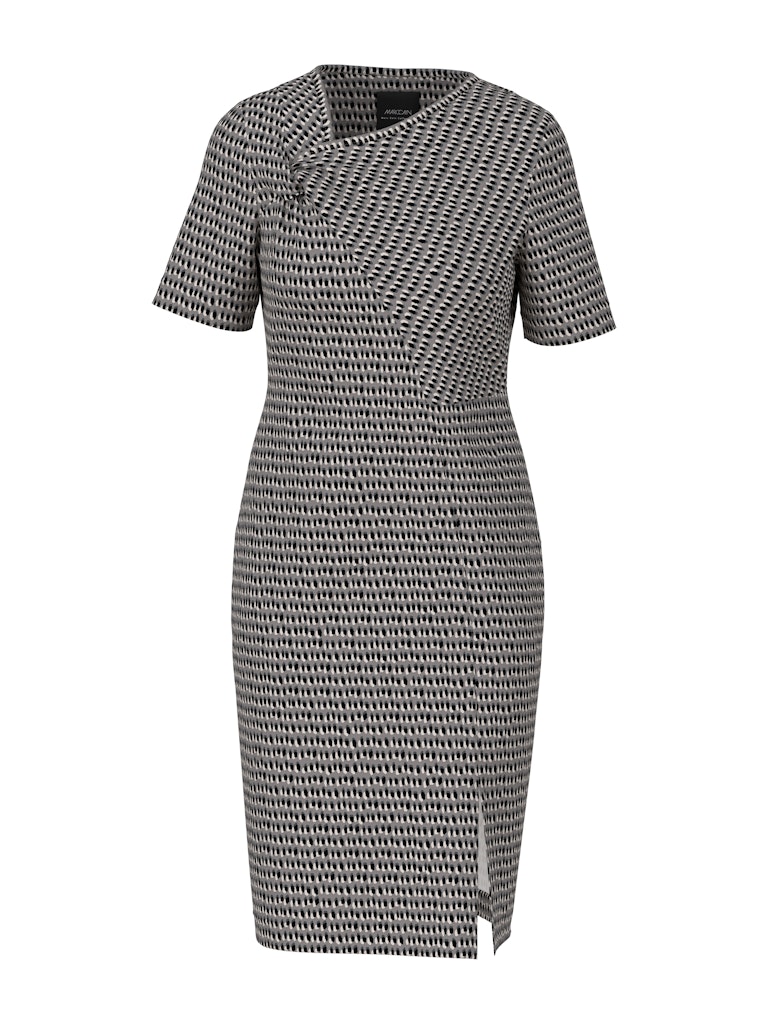 Asymmetrische jurk van Marc Cain in een jersey scuba kwaliteit met een all-over dessin, korte mouwen, plooidetail aan de hals en een split aan de voorzijde van de zoom.